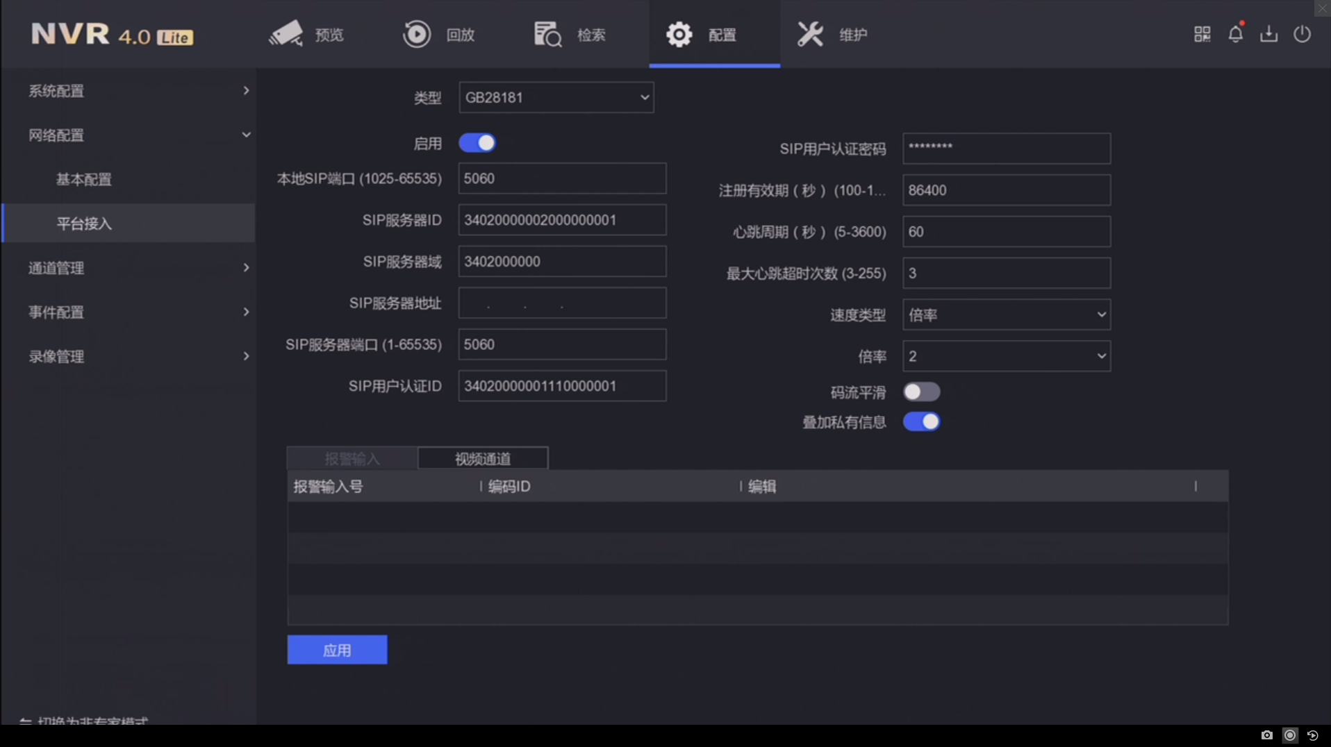 進(jìn)入系統(tǒng)管理→網(wǎng)絡(luò)配置→高級(jí)配置界面,接入類(lèi)型選擇“GB28181”,勾選“啟用”,根據(jù)平臺(tái)提供的信息對(duì)平臺(tái)參數(shù)和設(shè)備通道參數(shù)進(jìn)行設(shè)置(GB28181對(duì)接設(shè)置參數(shù)說(shuō)明見(jiàn)文末),點(diǎn)擊“應(yīng)用”保存設(shè)置。